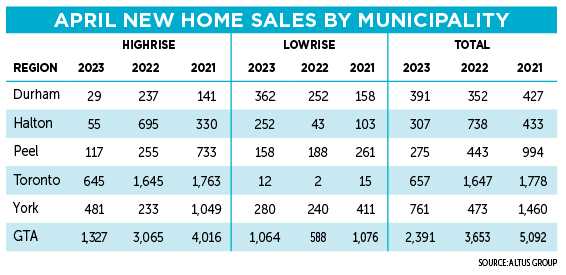 Condominium units, including in low-, medium- and highrise buildings, stacked townhouses and loft units, accounted for 1,327 units sold in April, down 57 per cent from April 2022 and 39 per cent below the 10-year average.