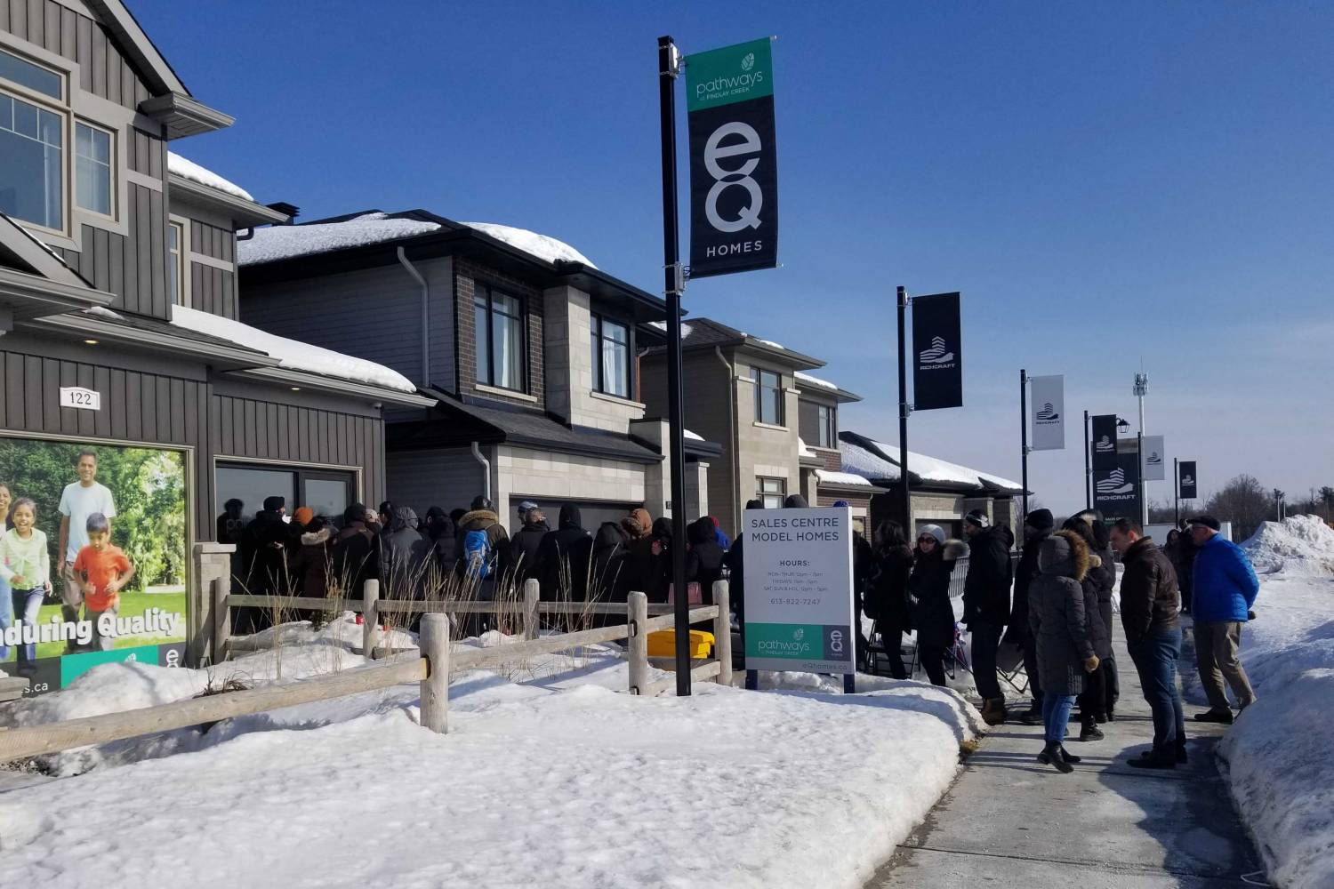 All hands were on deck Feb. 22 for a new eQ Homes townhome lot release at Pathways at Findlay Creek. James, Jennifer, Lucie and Cody were there to greet excited potential new-home owners. The line-up began at 5 p.m. on Thursday, Feb. 20, and by Friday afternoon, it numbered 15. eQ Homes provided handwarmers and pizza to those in line on Friday and by the time doors opened at 10 a.m. on Saturday, there were more people than available townhomes. The result? The release sold out by early afternoon.
