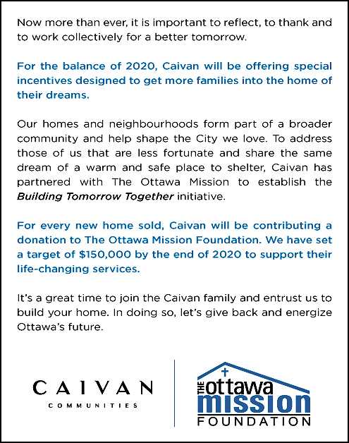 For the remainder of 2020, Caivan will be contributing a donation of every new home sold in their communities of Orleans Village, Fox Run and The Ridge to The Ottawa Mission Foundation.