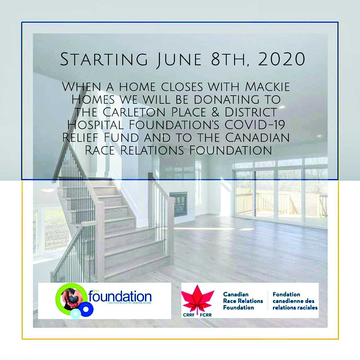 For every home it closes starting from June 8, and moving forward, the Mackie team will be donating to the Carleton Place & District Memorial Hospital Foundation to help relief efforts within the local Carleton Place and area community hospitals, as well as the Canadian Race Relations Foundation, a foundation committed to building a national framework for the fight against racism in Canada.