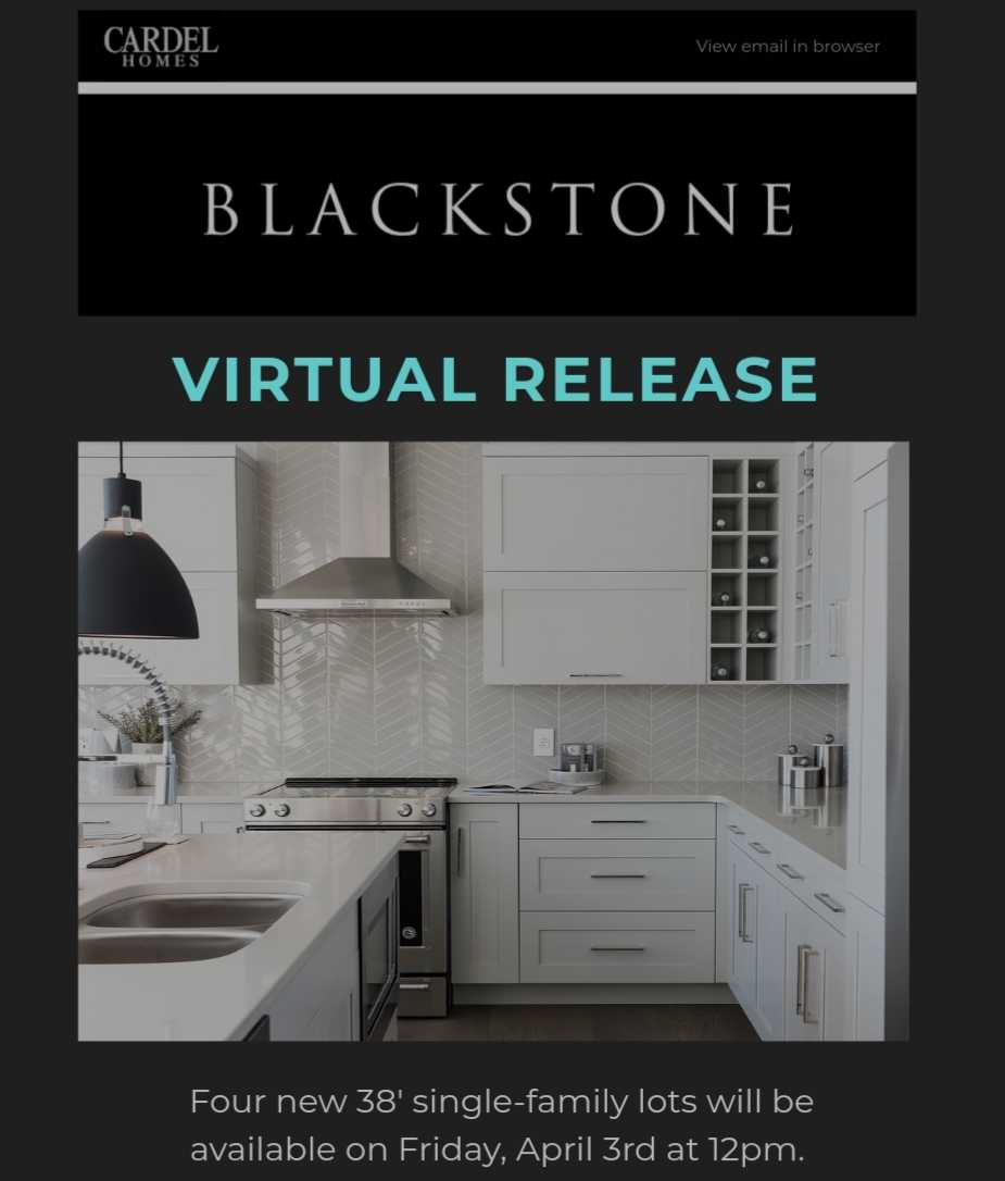 In an effort to still meet the needs of new-home buyers, Cardel Homes hosted its first virtual lot release at noon on Friday April 3. Four 38-ft. single-family lots were made available in its Blackstone community. Interested parties emailed their information to Cardel, and a lottery system followed.Virtual appointments were set up with buyers, and signatures were acquired electronically.