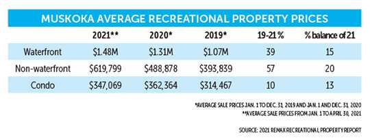 The surge began last year. In what’s known as the Lakelands region, including Muskoka, Haliburton, Orillia, Parry Sound, the median price for residential non-waterfront property in May 2020 was a record $416,500, up 7.3 per cent from $388,000 in May 2019. For waterfront property, more desirable and more expensive, the median price was $565,800, up 3.3 per cent from $547,550 over the same period.