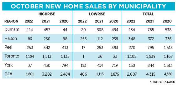Sales of new condominium units, including units in low-, medium and highrise buildings, stacked townhouses and loft units, with 1,601 units sold, were down 50 per cent from October 2021 and 40 per cent below the 10-year average.