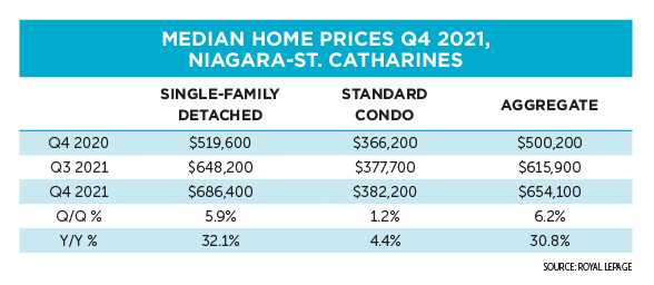 Part of the appeal for homebuyers in Niagara, of course, is affordability relative to Toronto and other parts of the Greater Toronto and Hamilton Area. But even that is changing. According to the latest Royal LePage House Price Survey, for the fourth quarter of 2021, aggregate median home prices in Niagara-St. Catharines were $654,100. This is up 6.2 per cent from $615,900 in the third quarter – but 30.8 per cent from $500,200 in the third quarter of 2020.