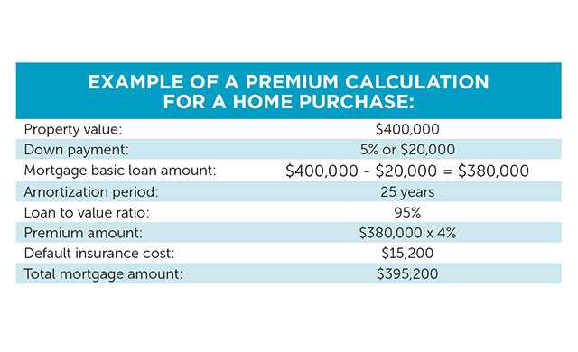 The mortgage default insurance premium is a one-time charge and it is paid by the borrower to the lender. The premium can be paid in a single lump sum at the time of closing or it can be added to the mortgage amount and repaid over the amortization period (or the life of the mortgage). The cost of default insurance is calculated by multiplying the amount of the funds that are being borrowed by the default insurance premium, which typically varies between 0.60 per cent and 5.85 per cent. Premiums vary depending on the amortization period of the mortgage, the loan to value ratio, the size of the down payment and the product.